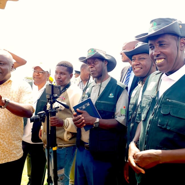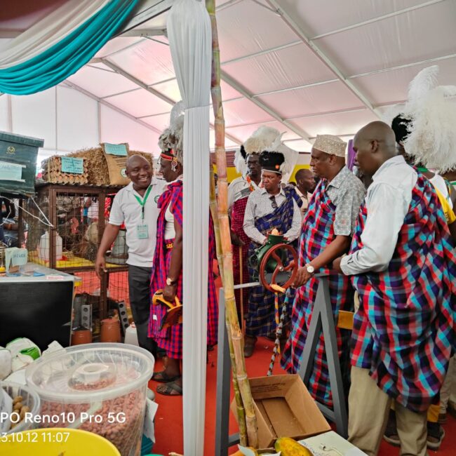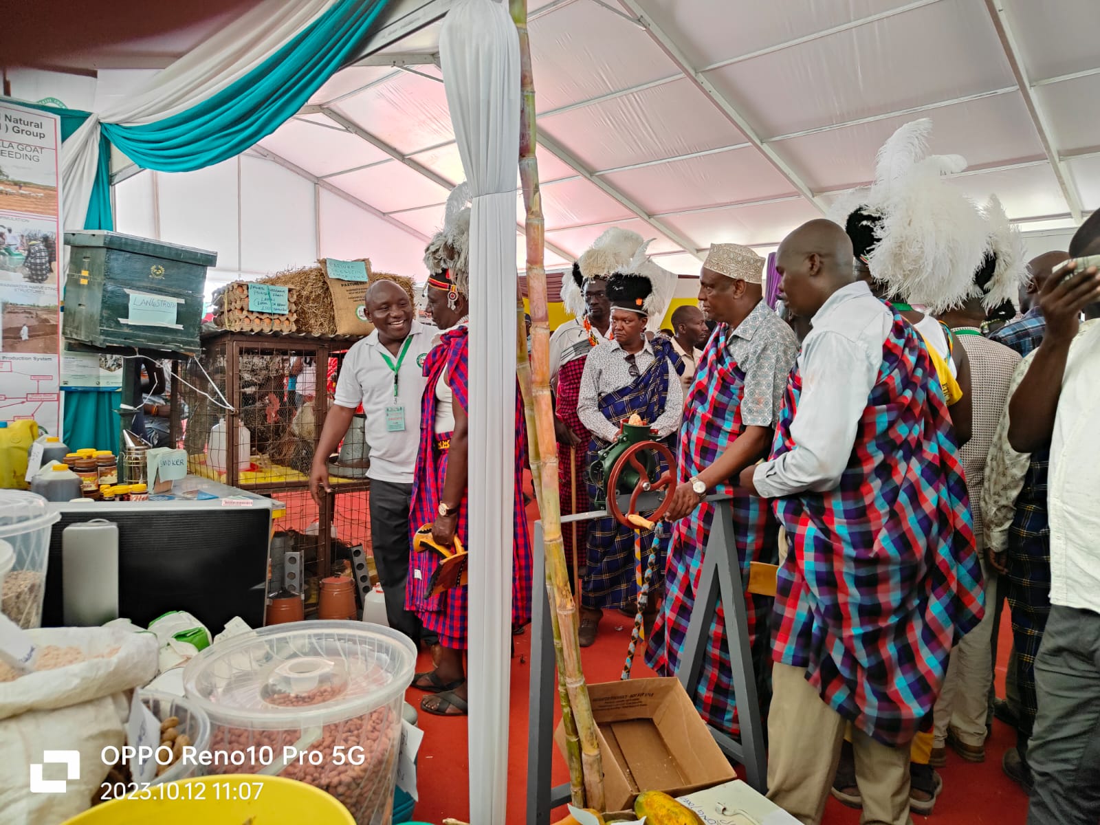 Ernest showcasing livestock production technologies to Kenyan President H.E Dr. William Ruto (wearing traditional attire) during a cultural and tourism event in Turkana County.